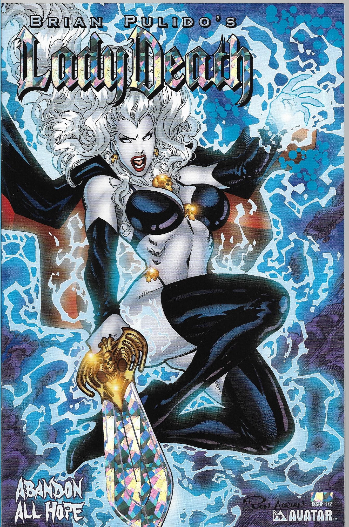 Wydawnictwo: Avatar . Tytuł : Brian Pulido's Lady Death : Abandon all Hope 1/2 /2005 . Komiks w języku angielskim. 16 stron. Stan Dobry : okladka lekko poprzecierana i minimalnie poprzyginana . Okladka z elementami FOIL .