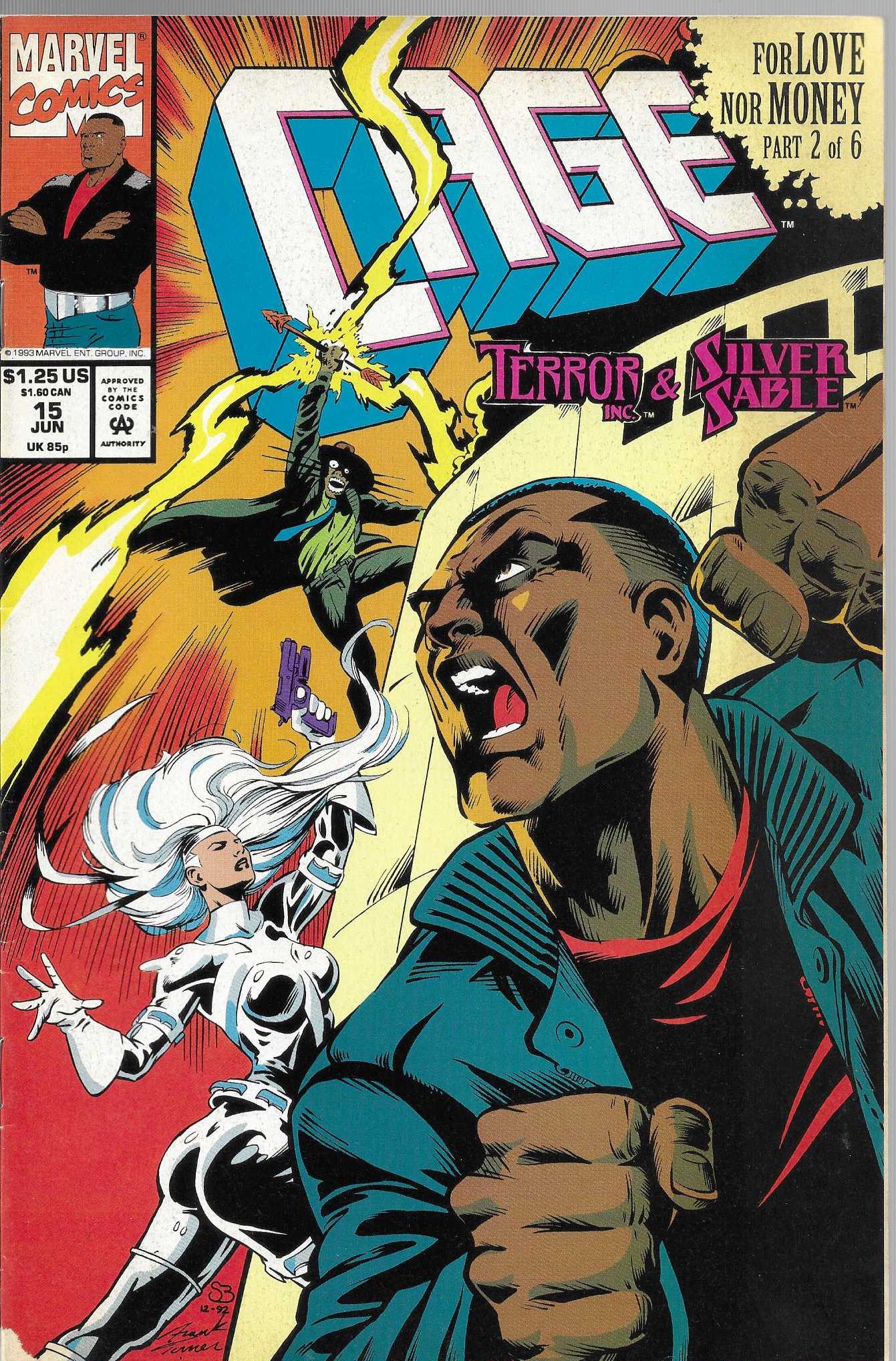 Wydawnictwo : Marvel Comics . Tytul : Cage 15/1993 ( Terror / Silver Sable ) . Komiks w języku angielskim . Wydanie kolorowe . 32 strony . Stan Dobry : okładka lekko poprzecierana i poprzyginana . Minimalne zalamania na grzbiecie komiksu . Lewy dolny rog okladki urwany .