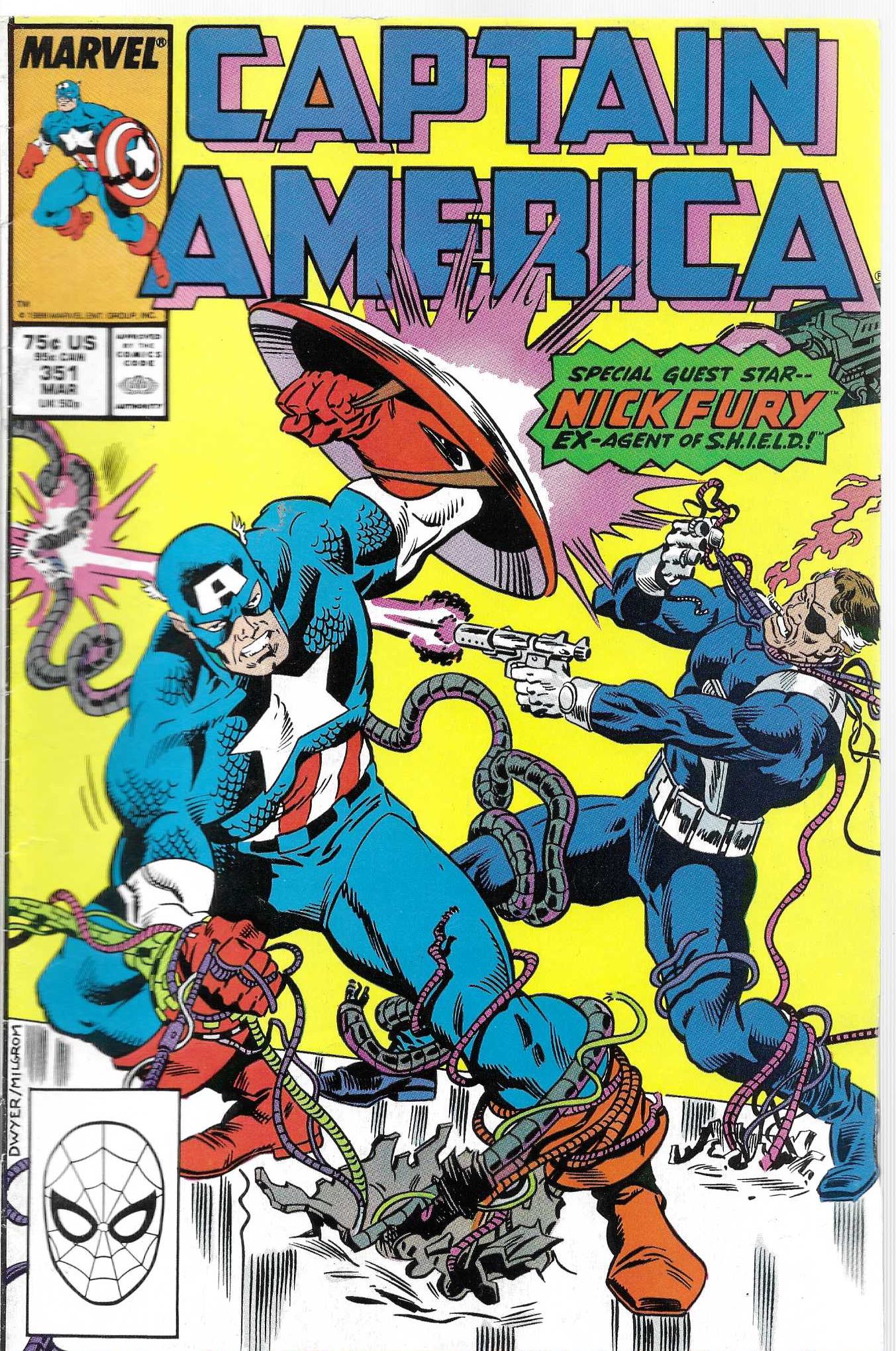 Wydawnictwo : Marvel Comics . Tytul : Captain America 351/1989 . Komiks w języku angielskim . Wydanie kolorowe .  32 strony . Stan dostateczny plus : okładka lekko podniszczona : poprzecierana i poprzyginana , zalamania na grzbiecie komiksu . Mimo tego srodek ok , czysty i bez wiekszych defektow !
