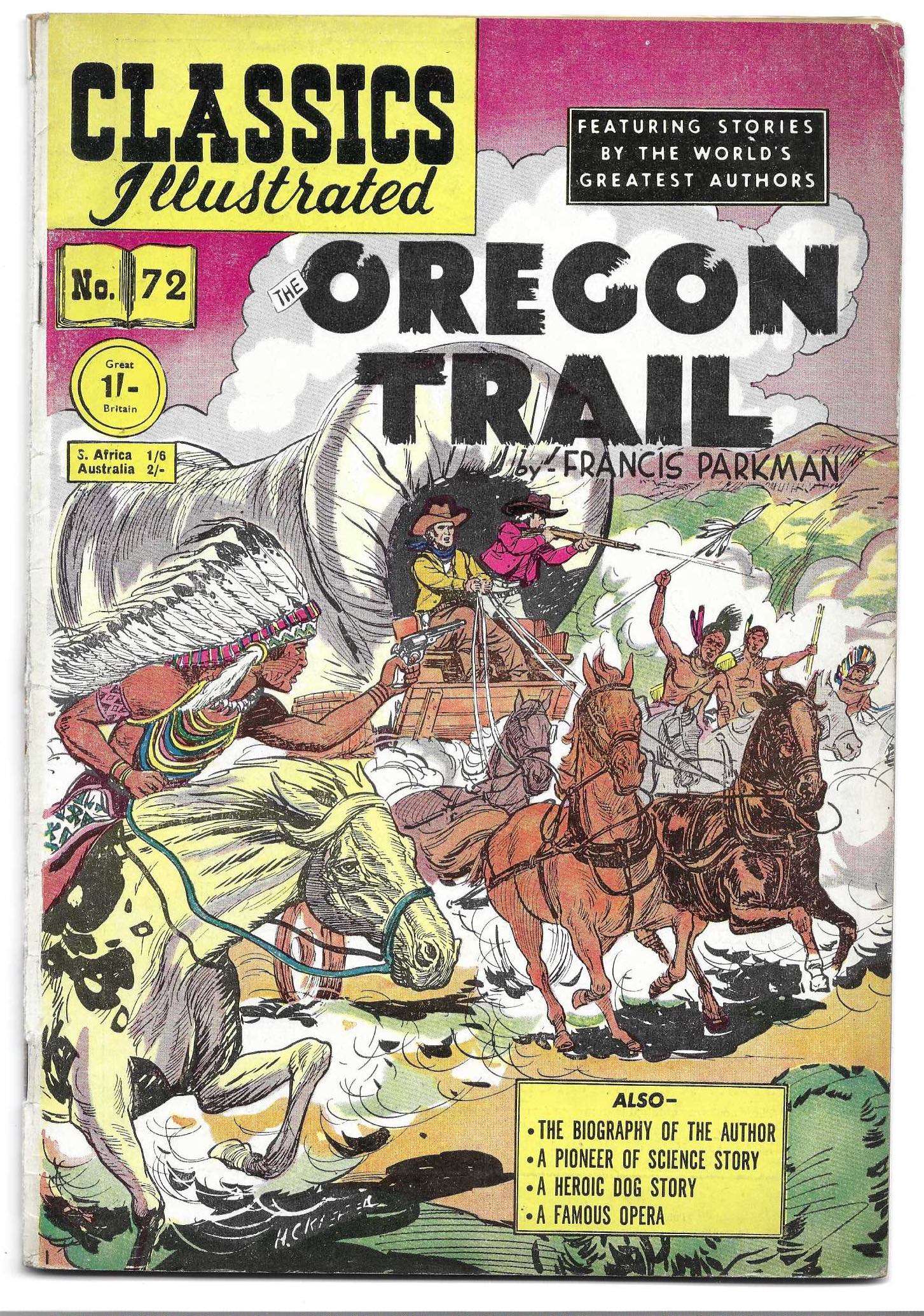 Wydawnictwo : Classics Illustrated Comics . Tytul : Classics Illustrated : The Oregon Trail 72/1958 ( rok wydania tego numeru w granicach 1958 - 1965 ) , . Komiks w języku angielskim . Wydanie kolorowe . 48 stron . Stan Dobry : okładka lekko poprzecierana i poprzyginana . Male rozerwanie na grzbiecie komiksu . Wydanie brytyjskie !
