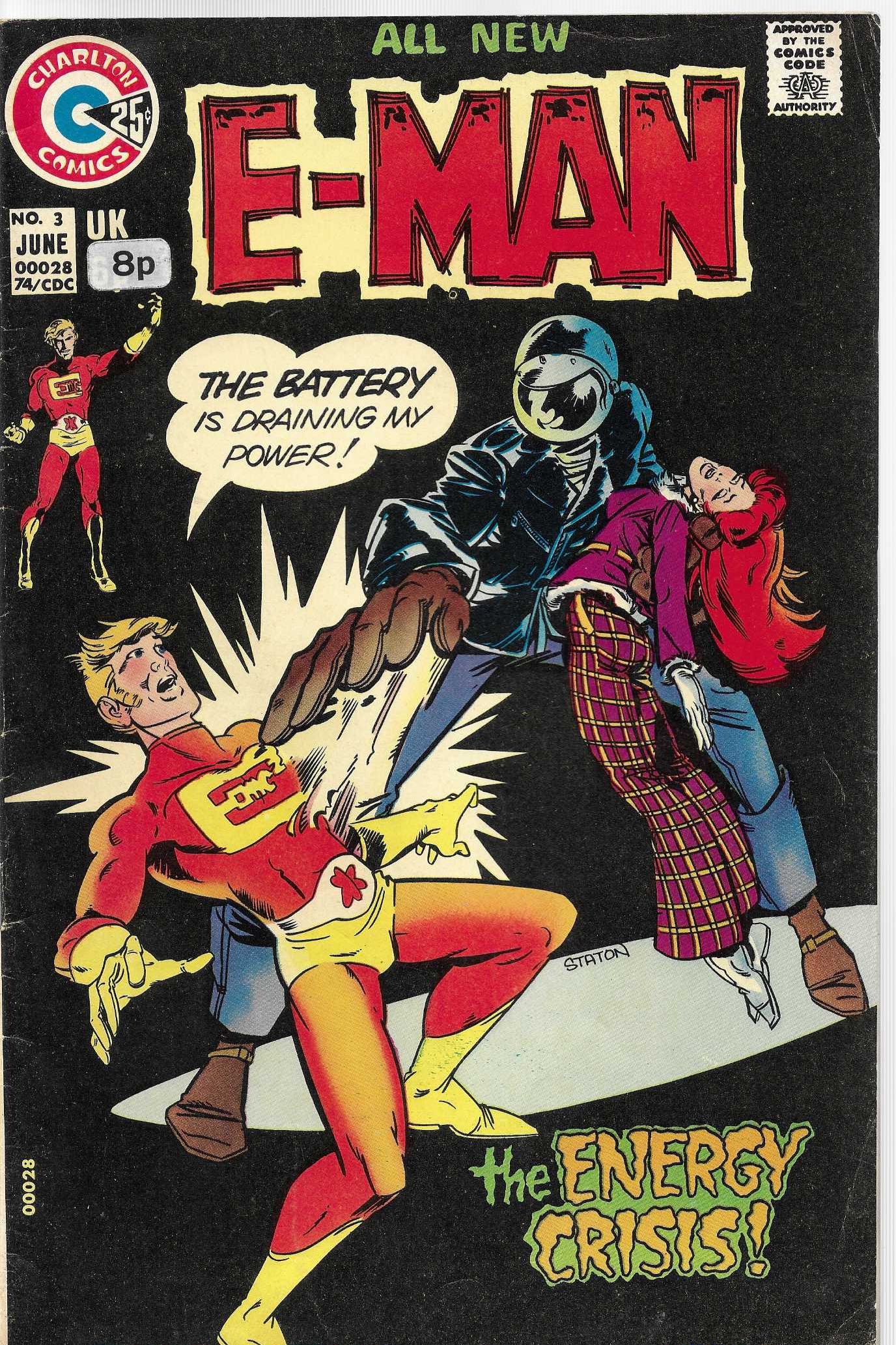 Wydawnictwo : Charlton Comics . Tytul : E-Man 3/1974 . Komiks w języku angielskim . Wydanie kolorowe . 32 strony . Stan Dobry : okładka lekko poprzecierana i poprzyginana . Minimalne zalamania na grzbiecie komiksu.