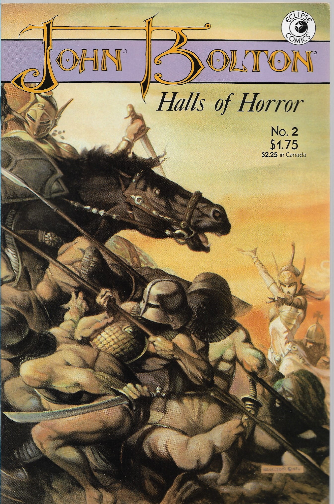 Wydawnictwo: Eclipse Comics . Tytuł: John Bolton : Halls of Horror 1-2/1985 . Komiks w języku angielskim . Wydanie kolorowe . Zeszyty po 32 strony . Stan Dobry : okładka lekko poprzecierana i poprzyginana . 1-2 , Komplet ! Okładka obu komiksów typu : Wraparound autorstwa Johna Boltona .