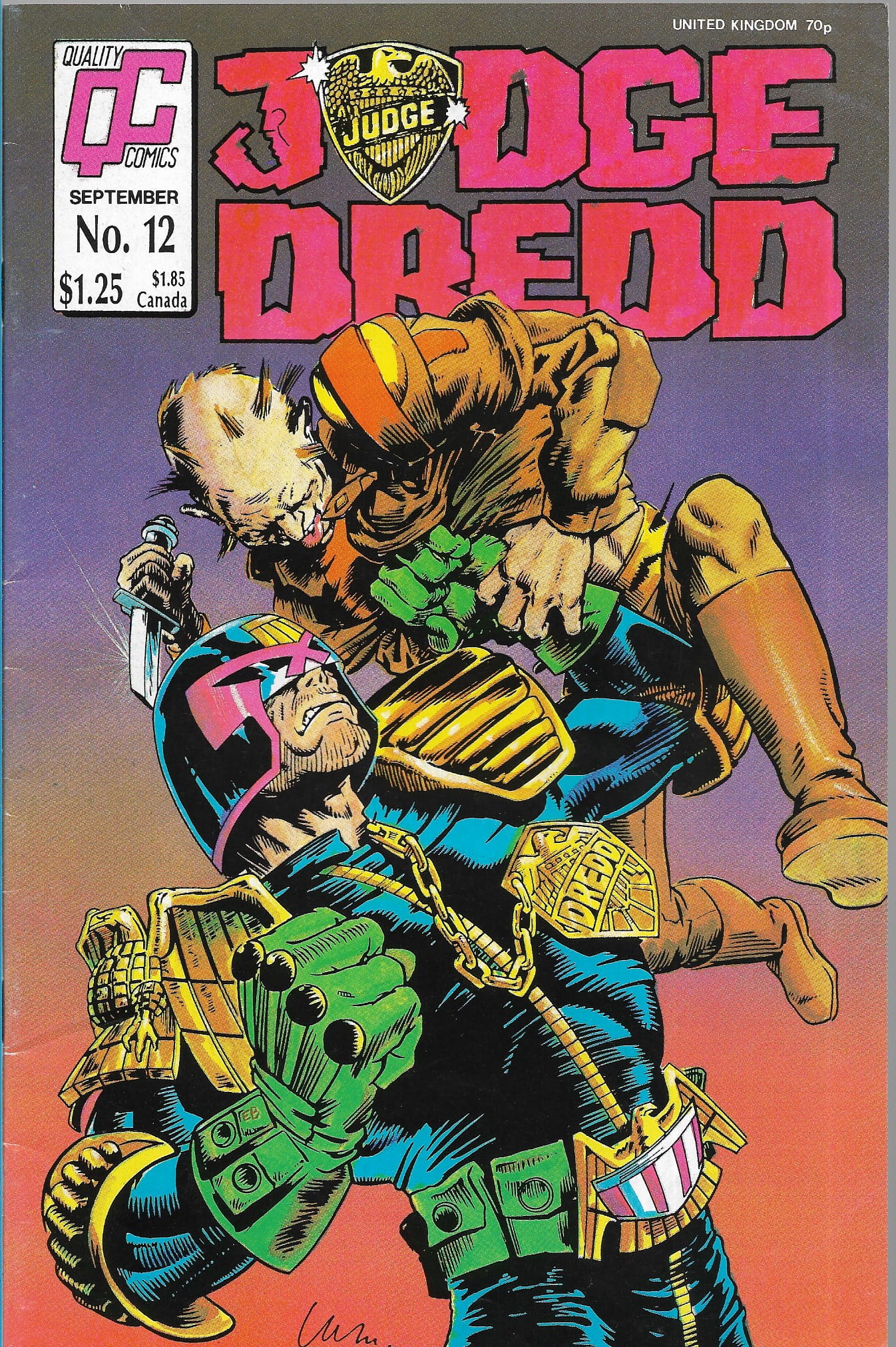 Wydawnictwo: Quality Periodicals . Tytuł: Judge Dredd 12/1987 ( 2000AD ) . Komiks w języku angielskim . 32 strony . Stan Dobry: okładka lekko poprzecierana i poprzyginana . Minimalne załamania wzdłuż grzbietu komiksu .