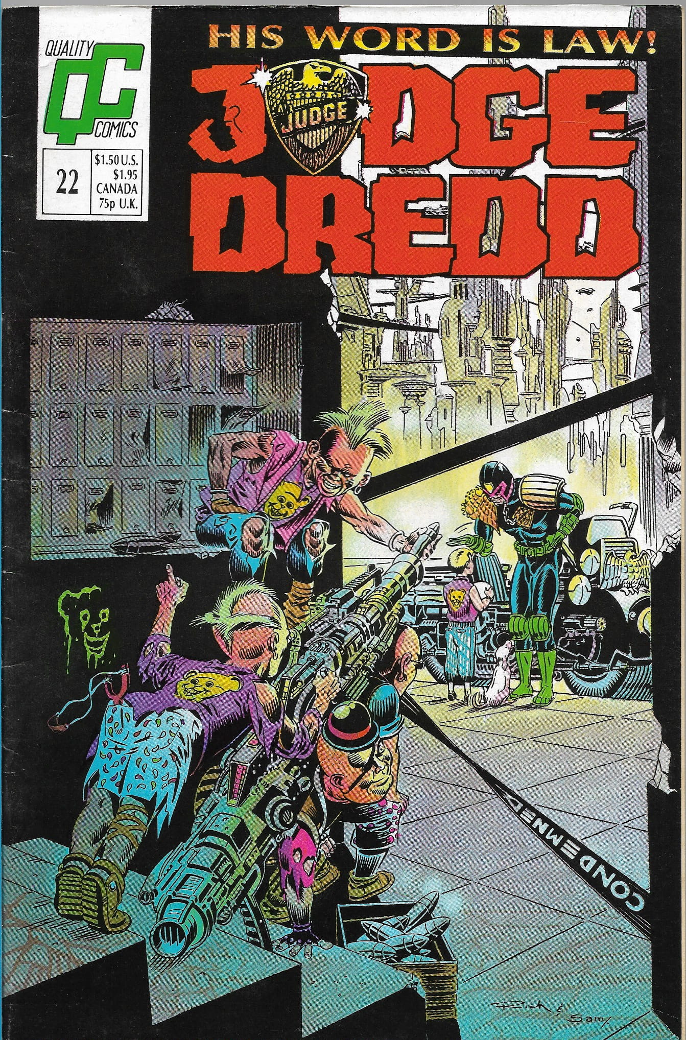 Wydawnictwo: Quality Periodicals . Tytuł: Judge Dredd 22/1988 ( 2000AD ) . Komiks w języku angielskim . 32 strony . Stan Dobry: okładka lekko poprzecierana i poprzyginana . Minimalne załamania wzdłuż grzbietu komiksu .