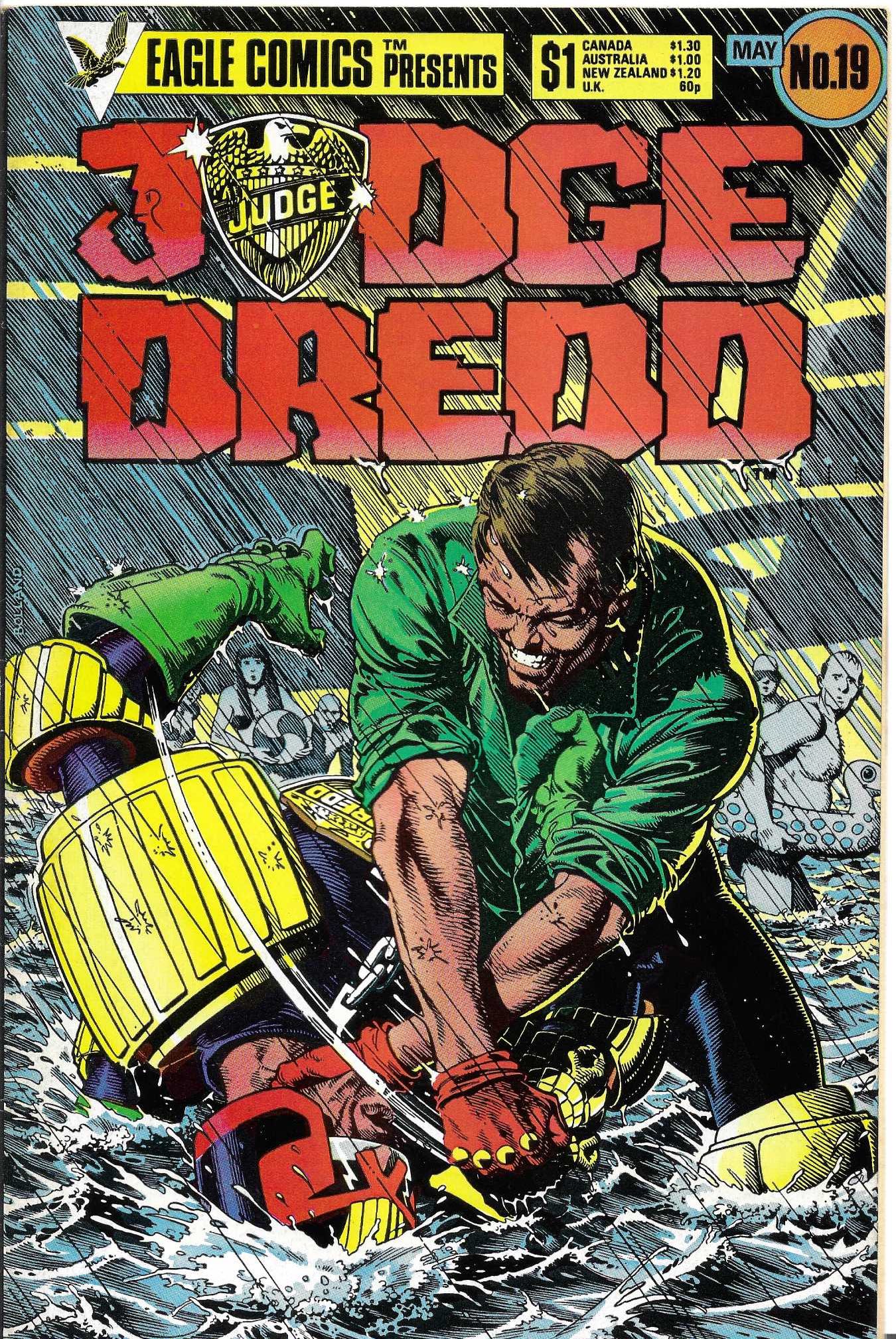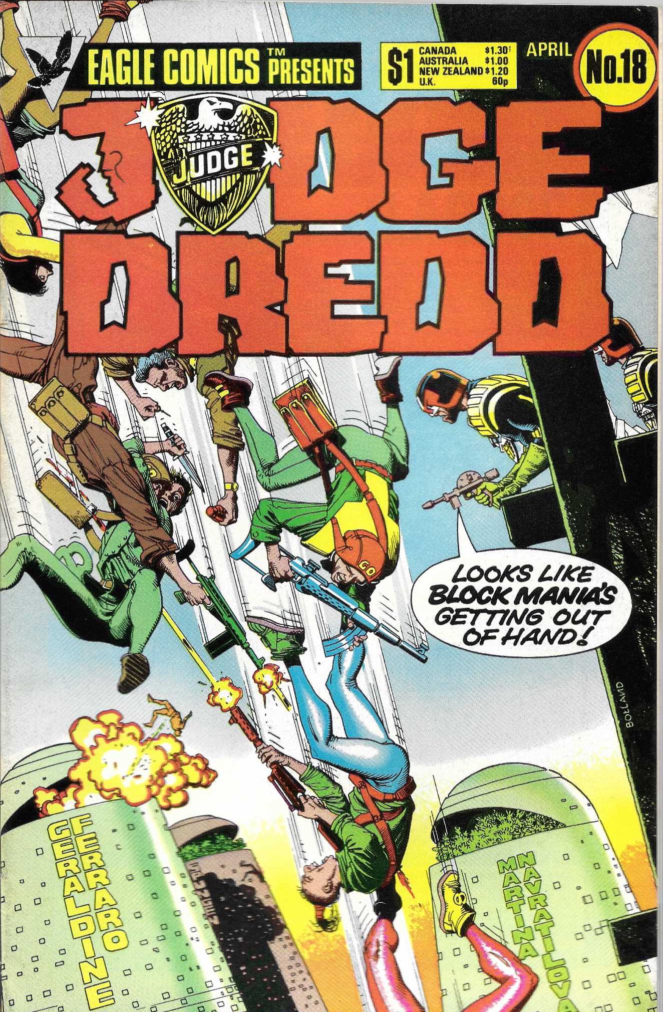 Wydawnictwo : Eagle Comics . Tytul : Judge Dredd 18-19/1985 . Komiks w języku angielskim . Wydanie kolorowe . Zeszyty po 32 strony . Stan Dobry : okładka lekko poprzecierana i poprzyginana . Minimalne zalamania i przetarcia na grzbiecie komiksu . Epizod : Block Mania 1-2 , Komplet .