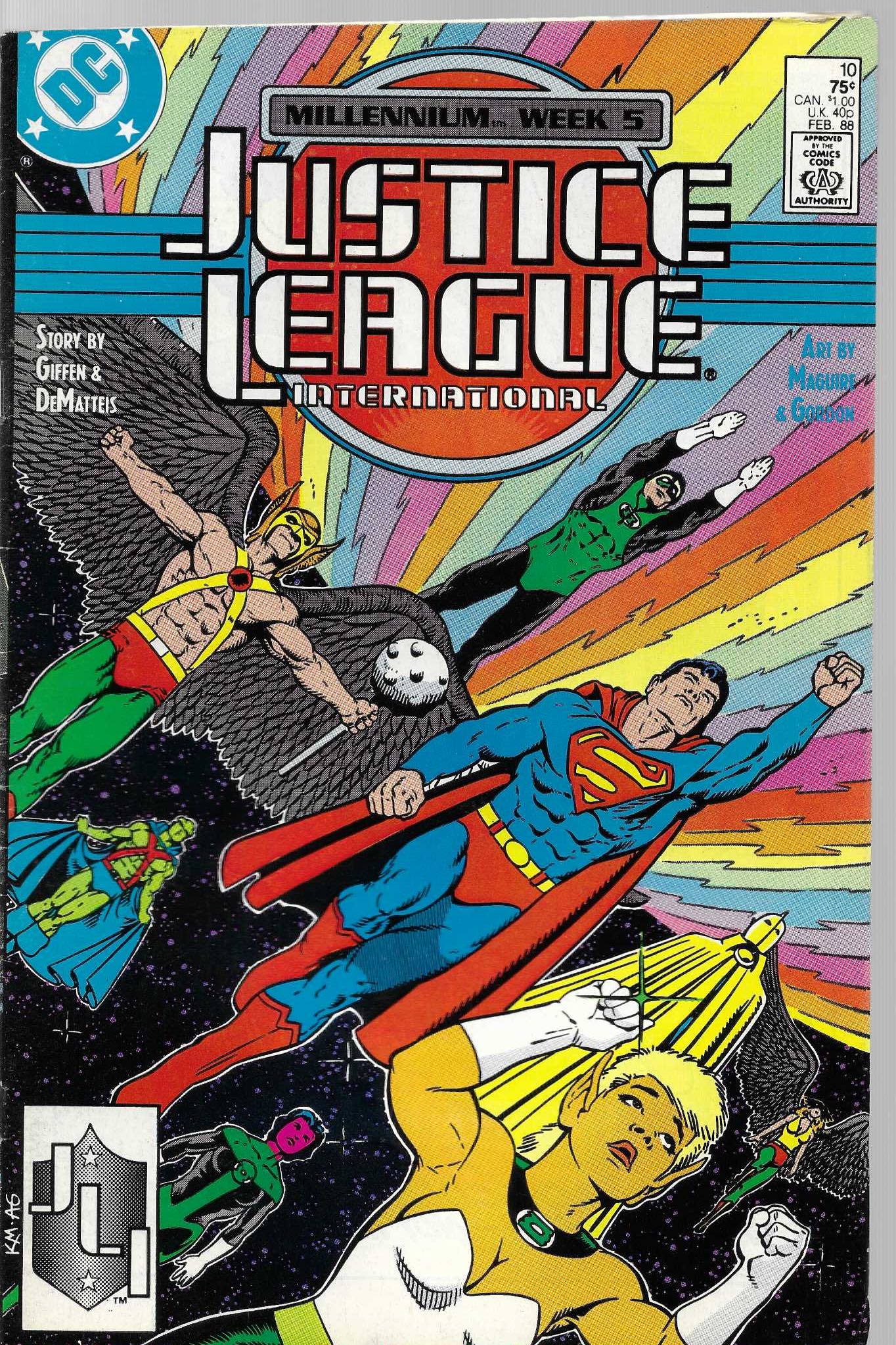 Wydawnictwo : DC Comics . Tytuł: Justice League International 10/1988 . Komiks w języku angielskim . Wydanie kolorowe . 32 strony . Stan Dobry minus : okładka lekko poprzecierana i poprzyginana . Małe załamania na grzbiecie komiksu .