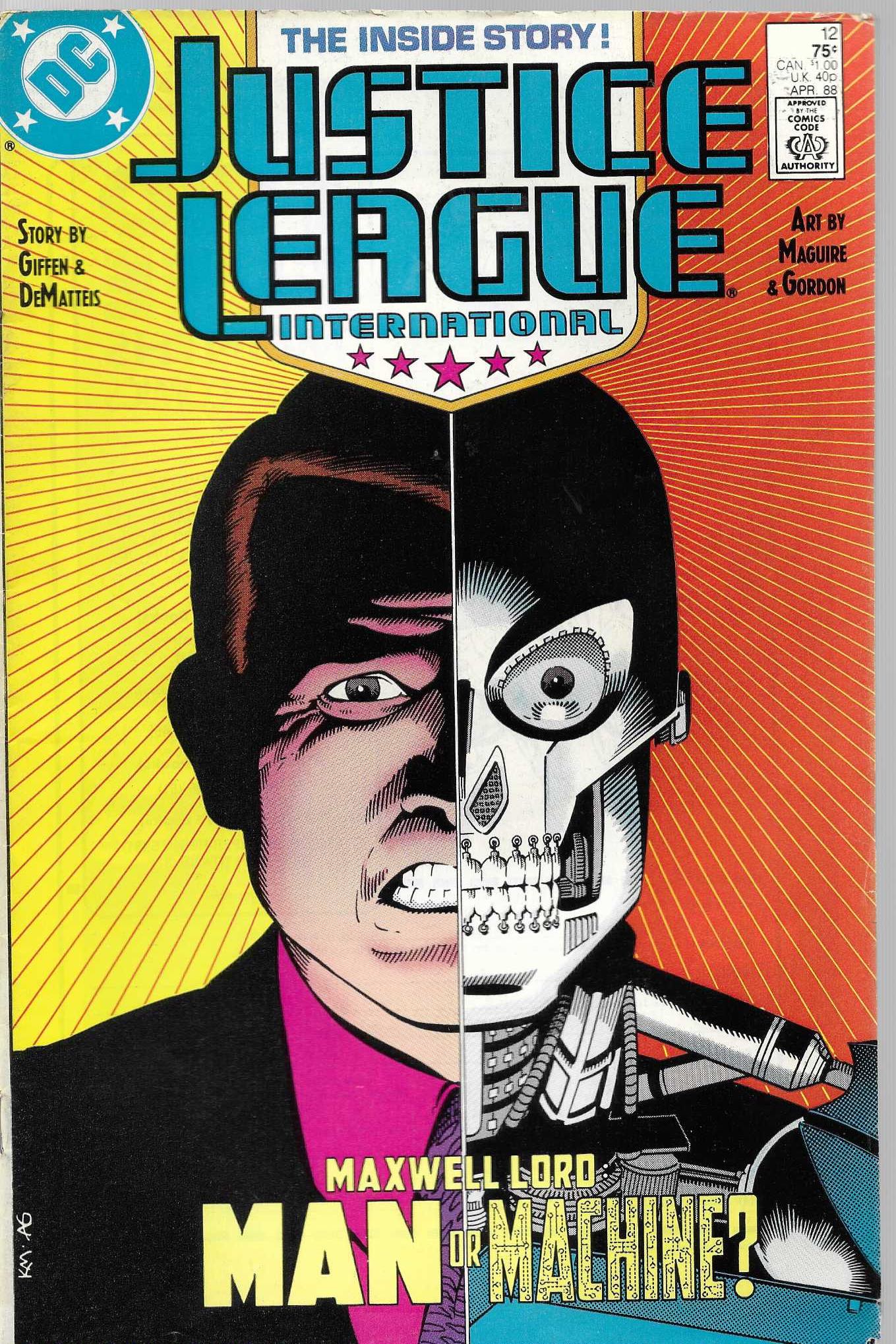 Wydawnictwo : DC Comics . Tytuł: Justice League International 12/1988 . Komiks w języku angielskim . Wydanie kolorowe . 32 strony . Stan Dobry minus : okładka lekko poprzecierana i poprzyginana . Małe załamania na grzbiecie komiksu .
