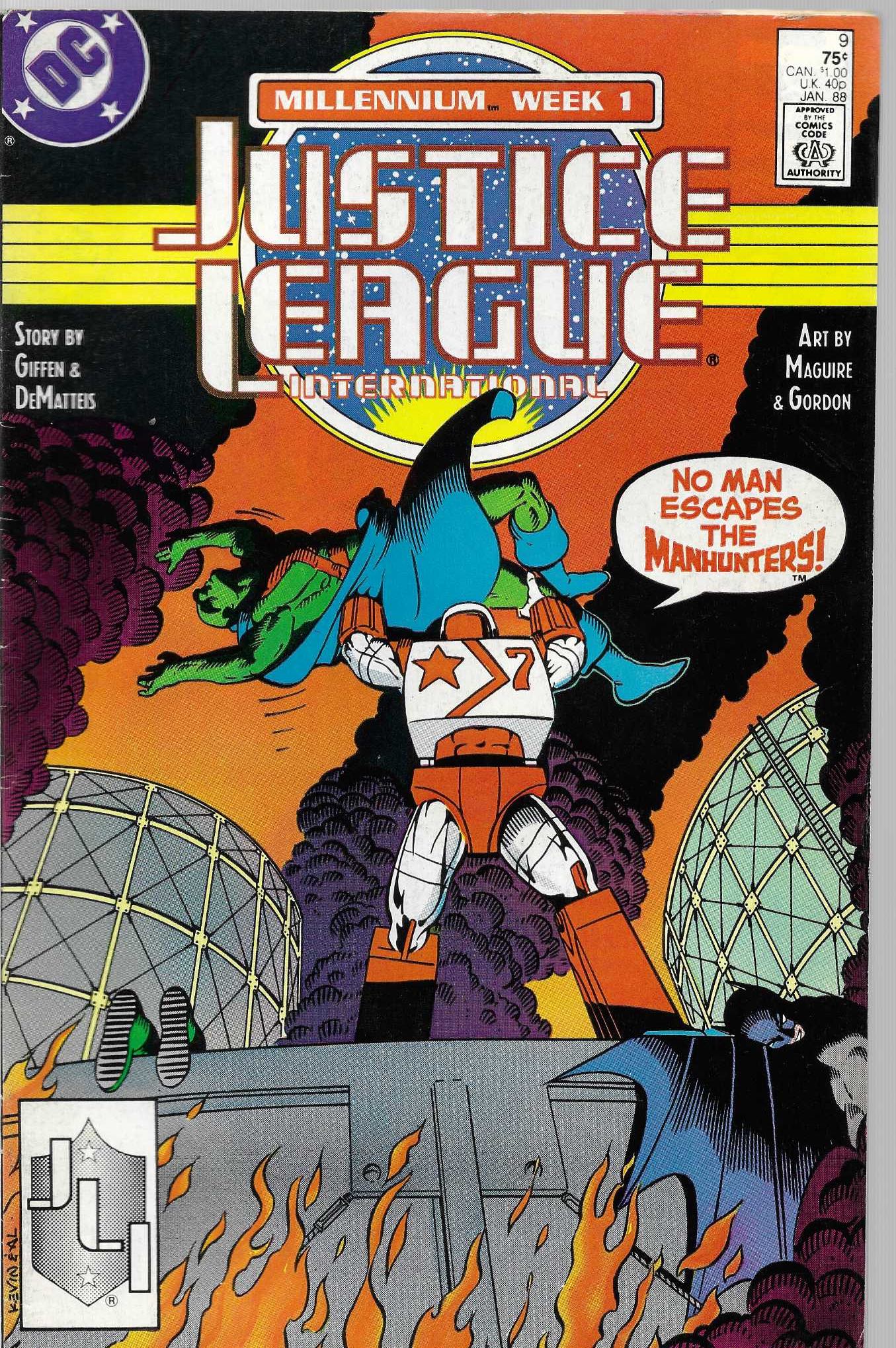 Wydawnictwo : DC Comics . Tytuł: Justice League International 9/1988 . Komiks w języku angielskim . Wydanie kolorowe . 32 strony . Stan Dobry minus : okładka lekko poprzecierana i poprzyginana . Małe załamania na grzbiecie komiksu .