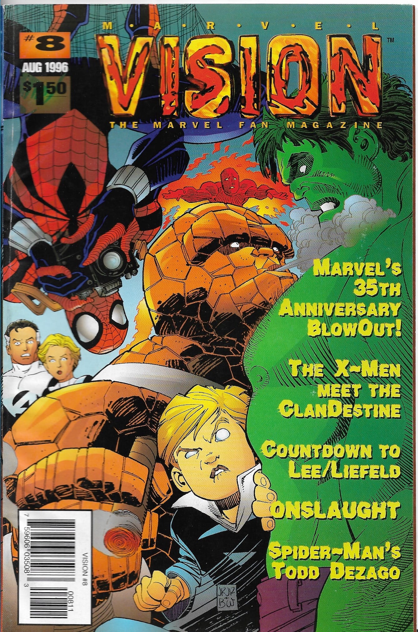 Tytuł: Marvel Vision 8/1996. Czasopismo w języku angielskim .Wydanie kolorowe . 64 strony . Stan : Okladka lekko poprzecierana i poprzyginana . Minimalne przetarcia . Okladka lekko pofalowana przy grzbiecie - wada fabryczna .