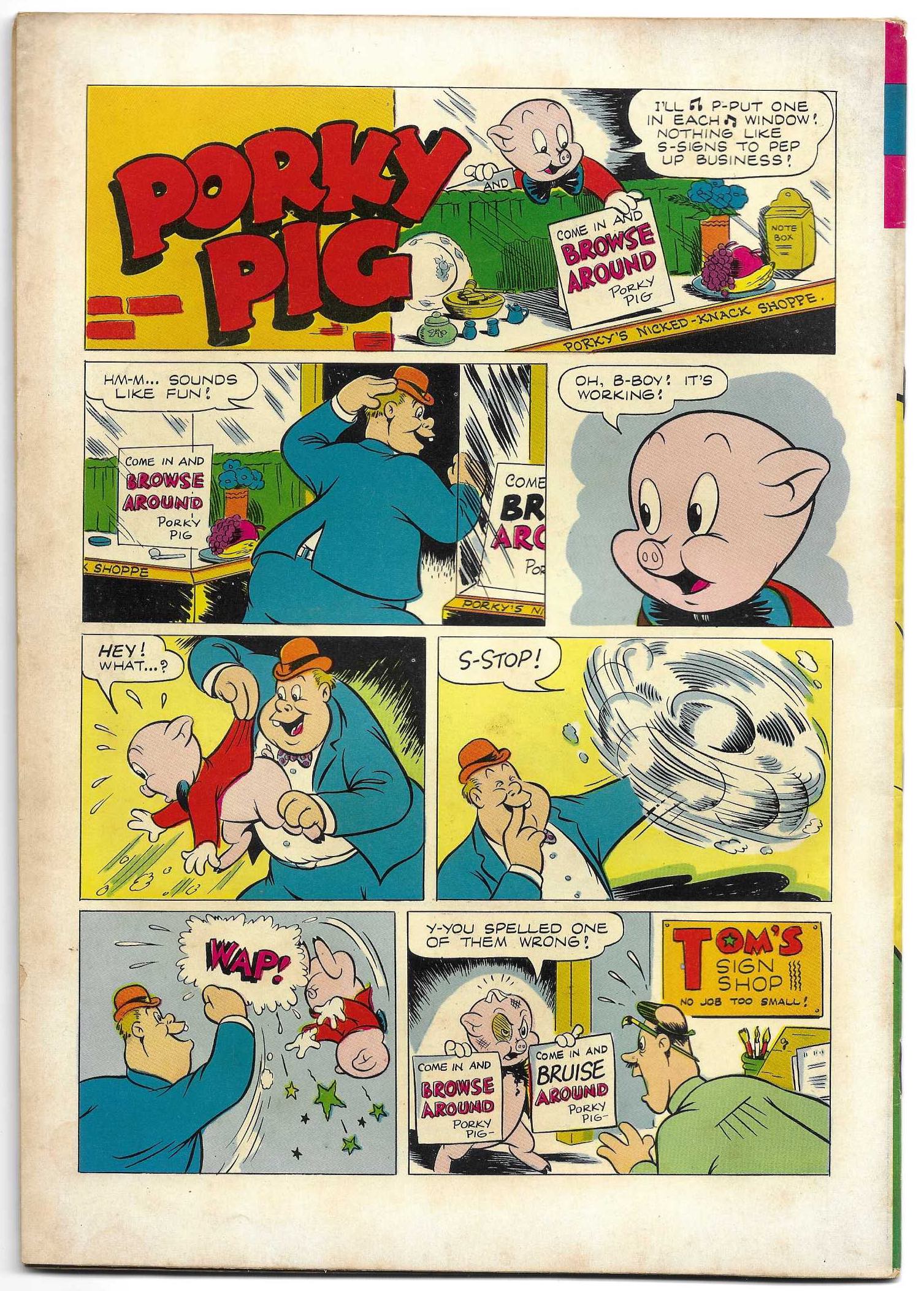 Opis Produktu : Comic book starring the Warner Bros. cartoon character Porky Pig. "Roaring Rockets," art by John Carey; Porky, Petunia, and Cicero go to an exhibit of wooden space ship models, where Bugs is the guard and guide; Porky gets hit on the head with the nozzle of a fire extinguisher and dreams that he and Bugs take off in a rocket ship and get stranded on an asteroid inhabited by a giant termite. "Boating Blues" text story. "Kitty Popped Corn" starring Tweety and Sylvester. Untitled story, script by Don R. Christensen, art by Ken Champin; Bugs helps Porky try to find the cause of squeaks in his car.