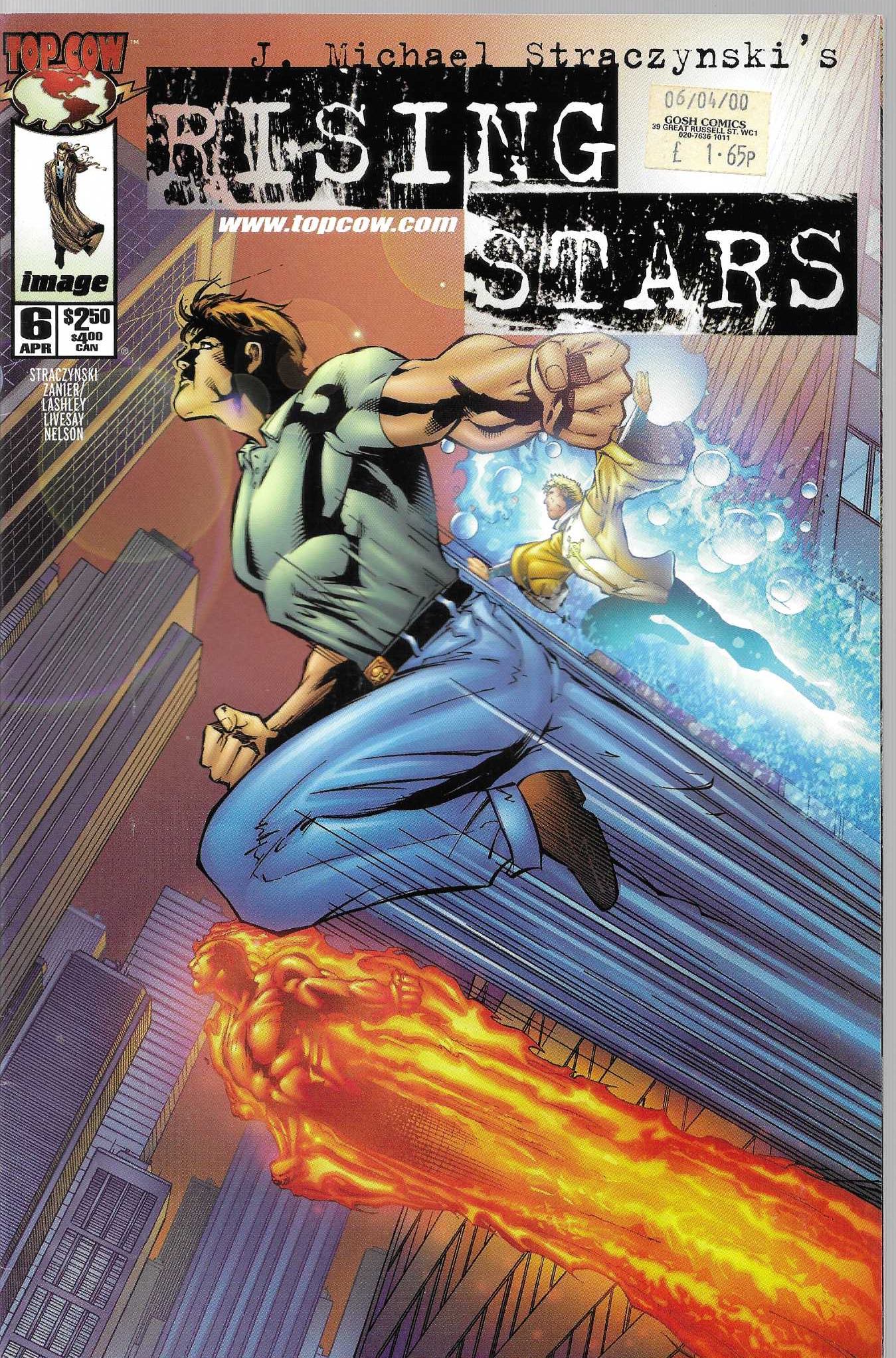 Wydawnictwo : Top Cow / Image Comics . Tytuł: Rising Stars 6/2000 . Komiks w języku angielskim . Wydanie kolorowe . 32 strony . Stan Dobry : okładka lekko poprzecierana i poprzyginana . Małe załamania na grzbiecie komiksu . Naklejka z cena na przedniej okładce .