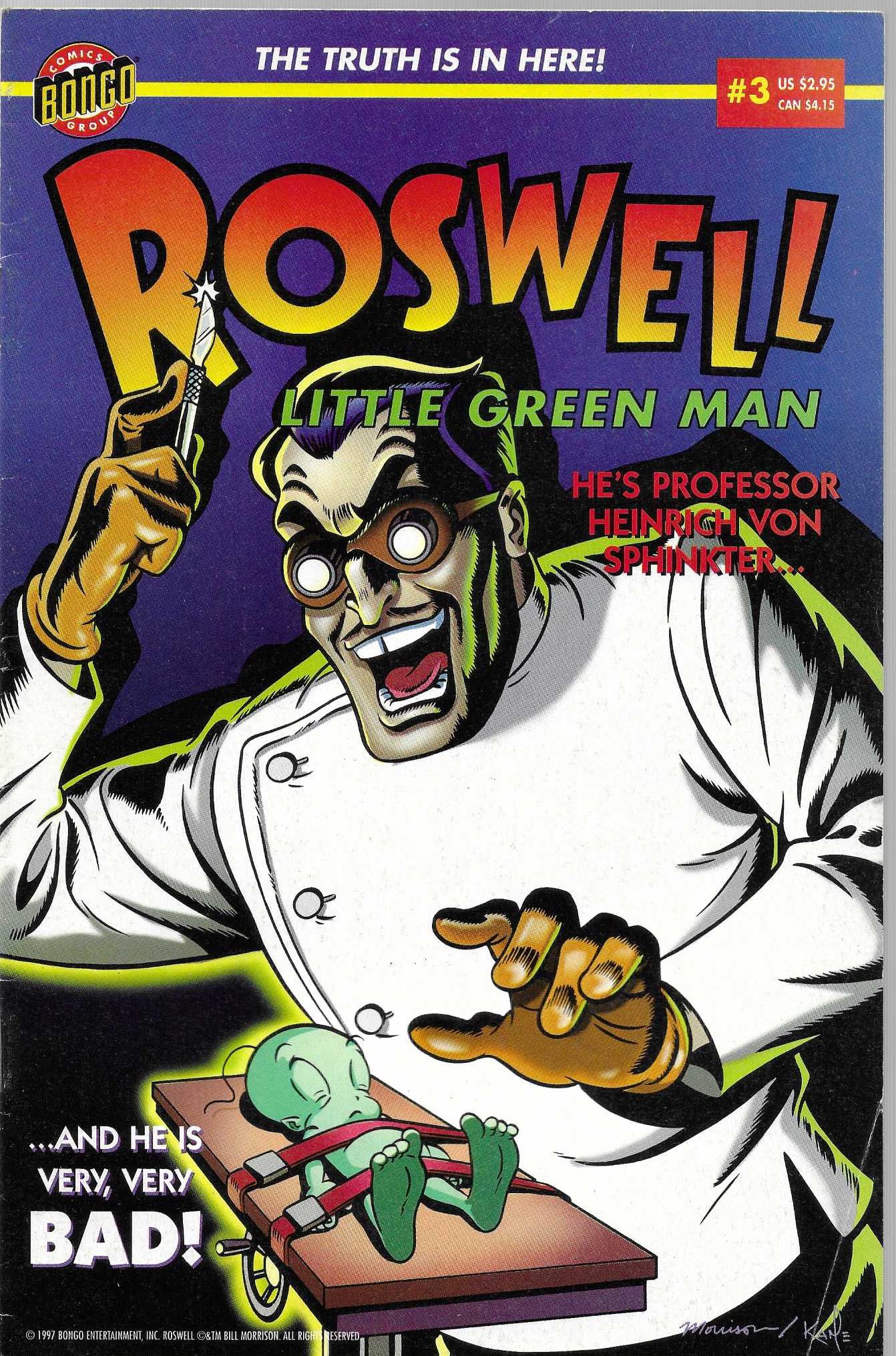 Wydawnictwo : Bongo Comics . Tytul : Roswell : Little Green Man 3/1997 . Komiks w języku angielskim . Wydanie kolorowe . 32 strony . Stan Dobry : okładka lekko poprzecierana i poprzyginana . Minimalne przetarcia na grzbiecie komiksu .