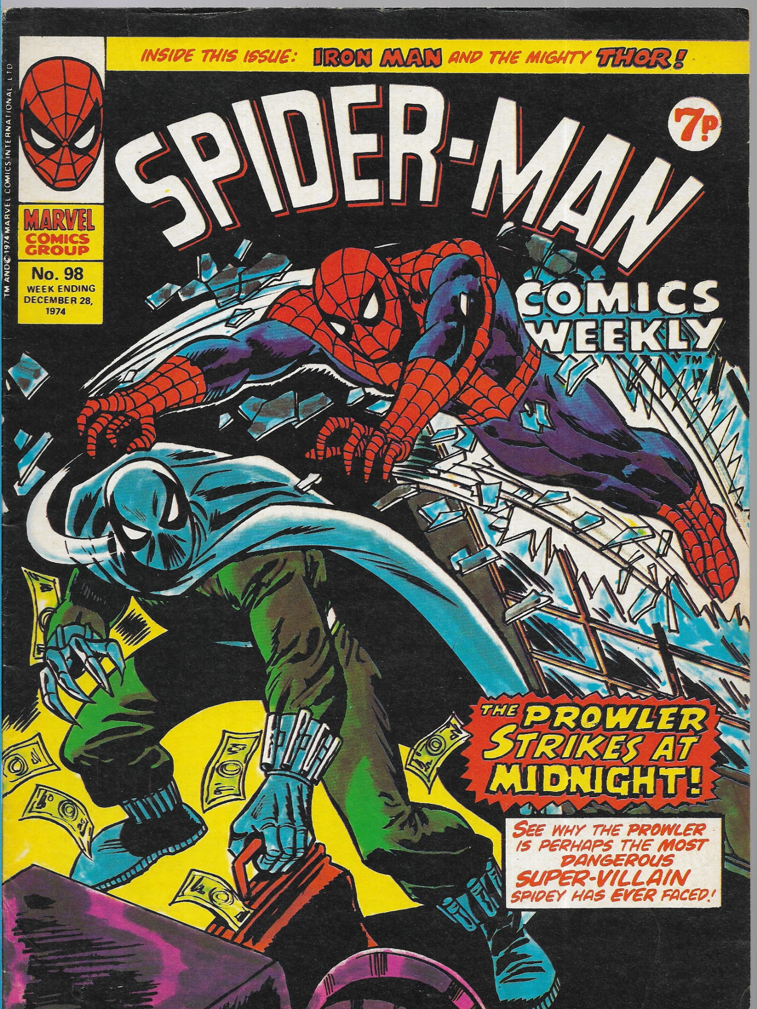Wydawnictwo: Marvel Comics Group ( UK ). Tytuł : Spider-man Comics Weekly 98/1974. Komiks w języku angielskim. Wydanie czarno-białe . 32 strony . Stan Dobry minus : okładka lekko poprzecierana i poprzypinana. Parę rogów lekko przygiętych , minimalne ubytki na krawędziach .