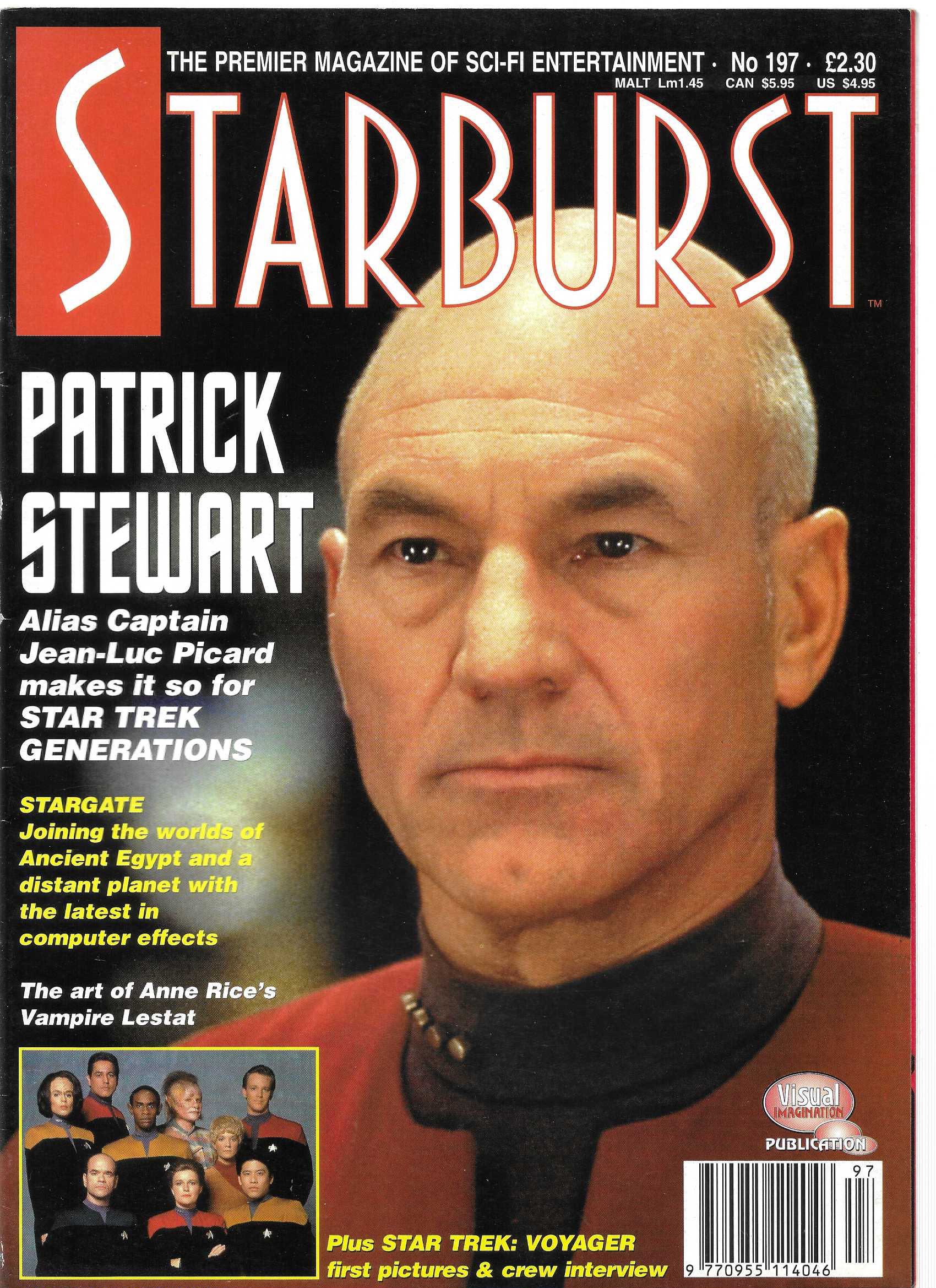 Opis Produktu : Starburst is Britain's "premier magazine of sci-fi entertainment." Issue #197 includes: Patrick Stewart makes it so for Star Trek Generations; Stargate - joining the worlds of Ancient Egypt and a distant planet with the latest in computer effects; the art of Anne Rice's Vampire Lestat; Star Trek: Voyager crew interview. Patrick Stewart cover.