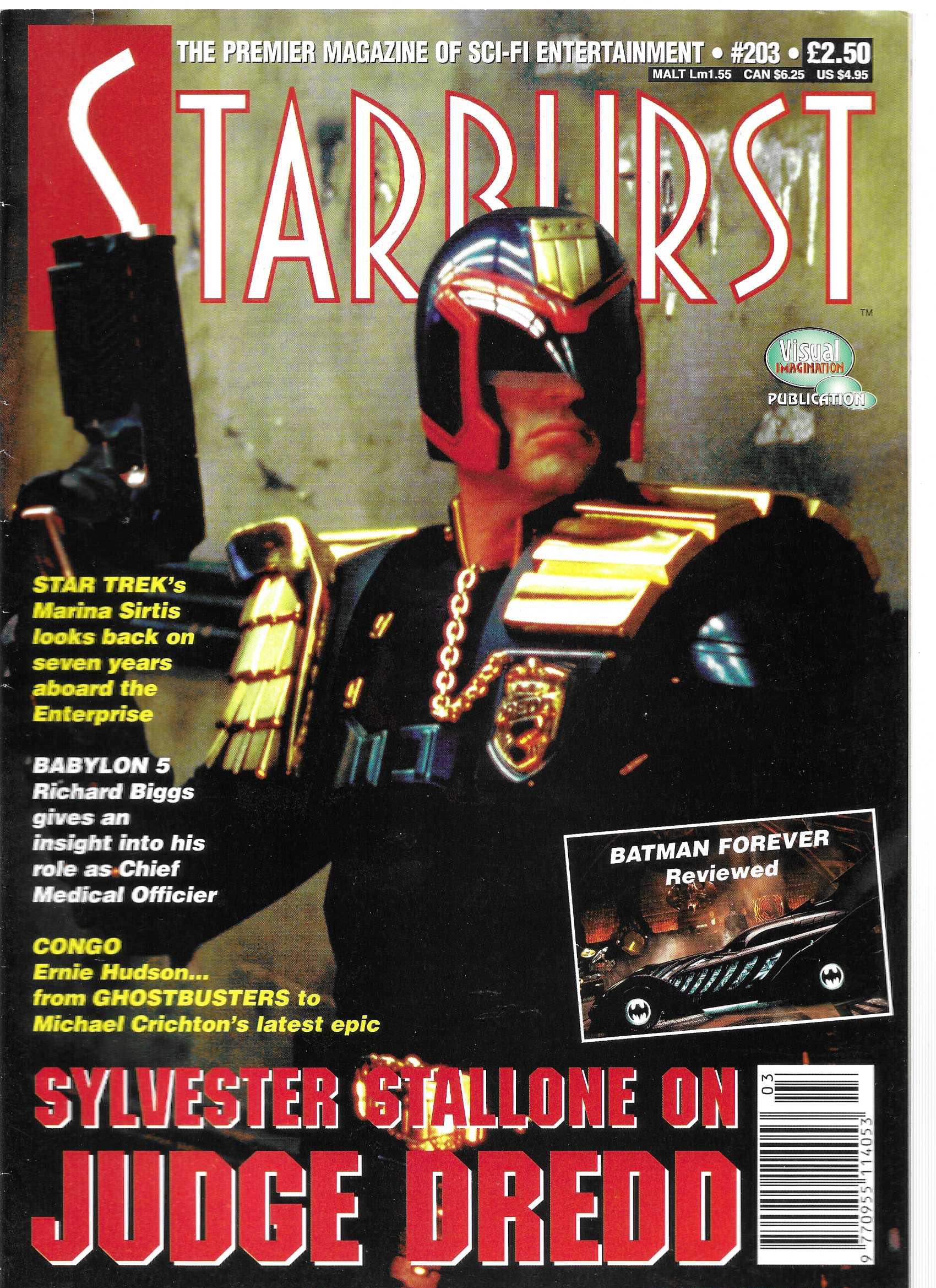 Opis Produktu : Starburst is Britain's "premier magazine of sci-fi entertainment." Issue #203 includes: Sylvester Stallone on Judge Dredd; Marina Sirtis looks back on seven years aboard the Enterprise; Babylon 5's Richard Biggs gives an insight into his role as Chief Medical Officer; review of Batman Forever; Congo - Ernie Hudson goes from Ghostbusters to Michael Crichton's epic. Stallone Judge Dredd cover.