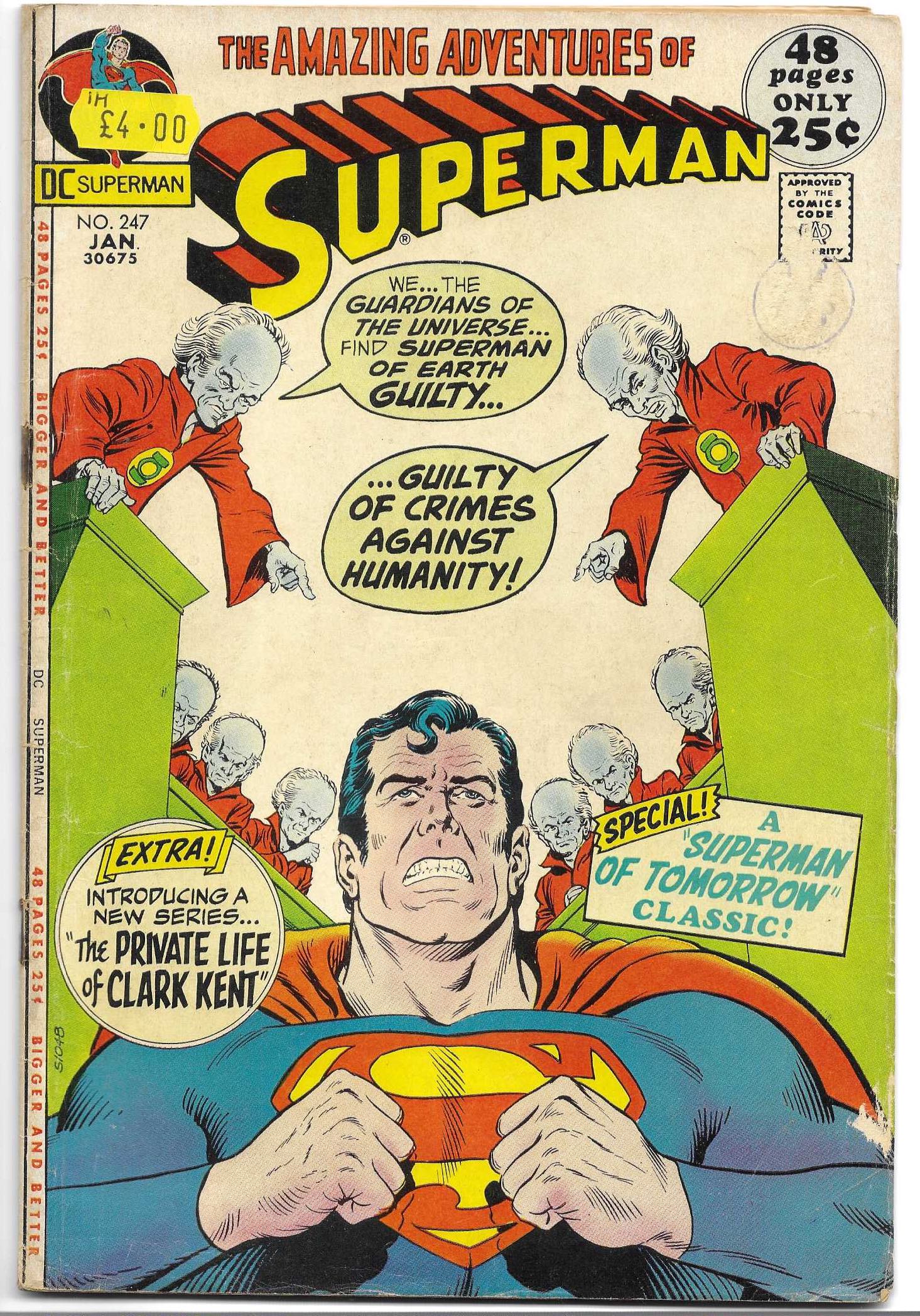 Wydawnictwo : DC Comics . Tytul : Superman 247/1972 . Komiks w języku angielskim . Wydanie kolorowe . 48 stron . Stan dobry minus : okładka podniszczona : poprzecierana i poprzyginana . Zalamania i ubytki na grzbiecie komiksu . Okladka trzyma sie na jednym spinaczu . Naklejka na przedniej okladce .