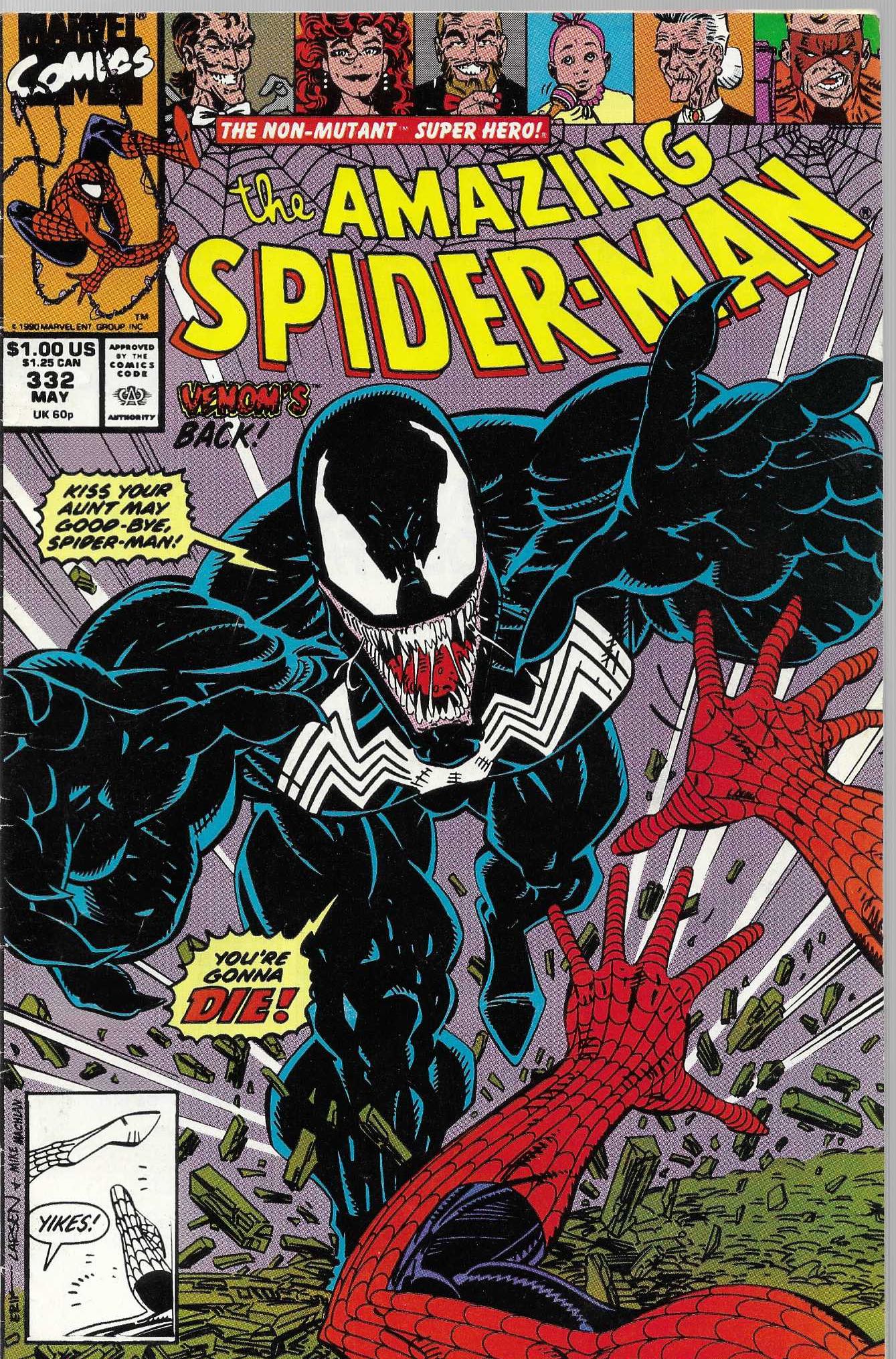 Wydawnictwo: Marvel Comics . Tytuł: The Amazing Spider-man 332/1990 . Komiks w języku angielskim . Wydanie kolorowe . 32 strony . Stan : dostateczny plus : okładka lekko zmęczona , pogięta , poprzecierana . Mimo tego środek trzyma sie kupy , jest czysty i bez większych defektów , parę rogów przygiętych .