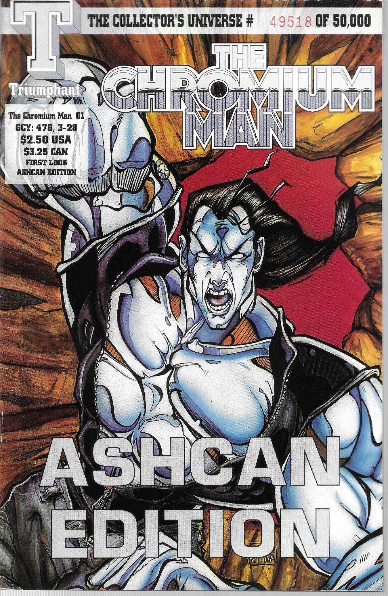 Wydawnictwo: Triumphant Comics . Tytuł: The Chromium Man 1/1993 . Komiks w języku angielskim . Wydanie kolorowe . 32 strony . Stan Dobry : okładka lekko poprzecierana i poprzyginana . Male przetarcia i zalamania na grzbiecie komiksu . Komiks limitowany i numerowacy .