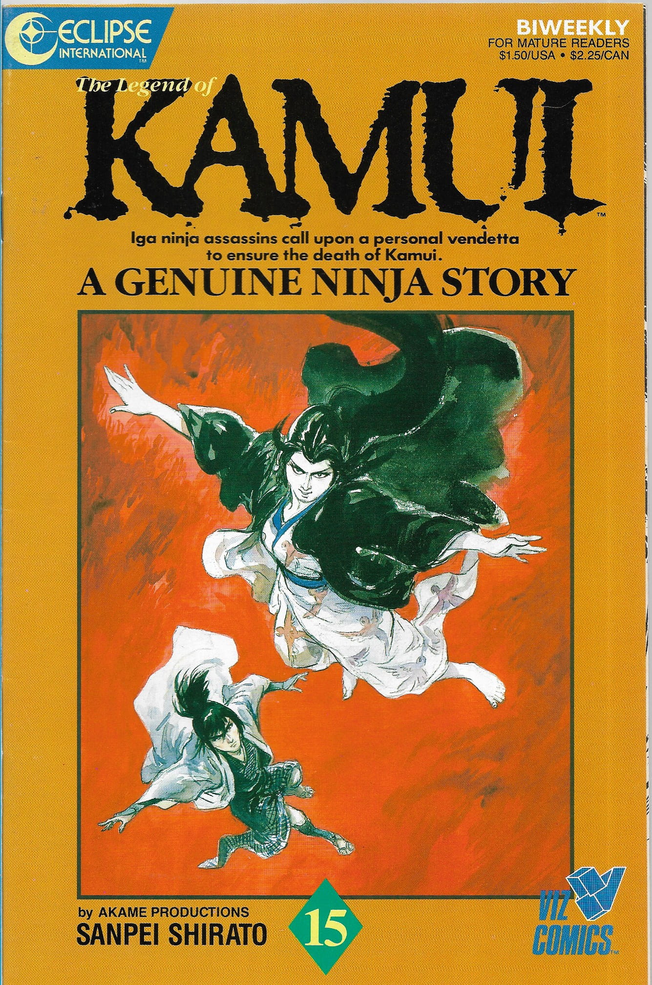 Wydawnictwo : Eclipse Comics . Tytul : The Legend of Kamui 15/1987 ( a genuine ninja story ) . Komiks w języku angielskim . Wydanie czarno-białe . 32 strony . Stan Dobry : okładka lekko poprzecierana i poprzyginana .