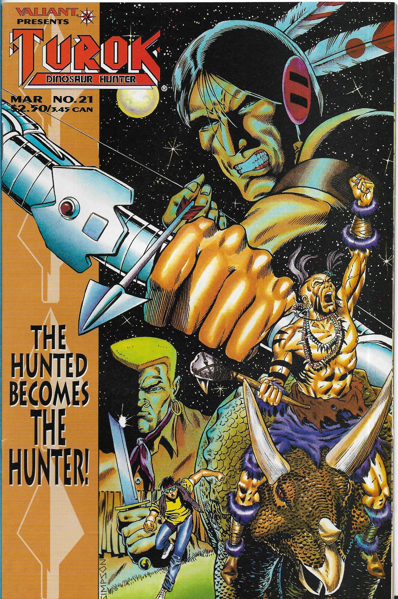 Wydawnictwo : Valiant Comics . Tytul : Turok : Dinosaur Hunter 21/1995 . Komiks w języku angielskim . 32 strony . Stan dobry : okładka lekko poprzecierana i poprzyginana .