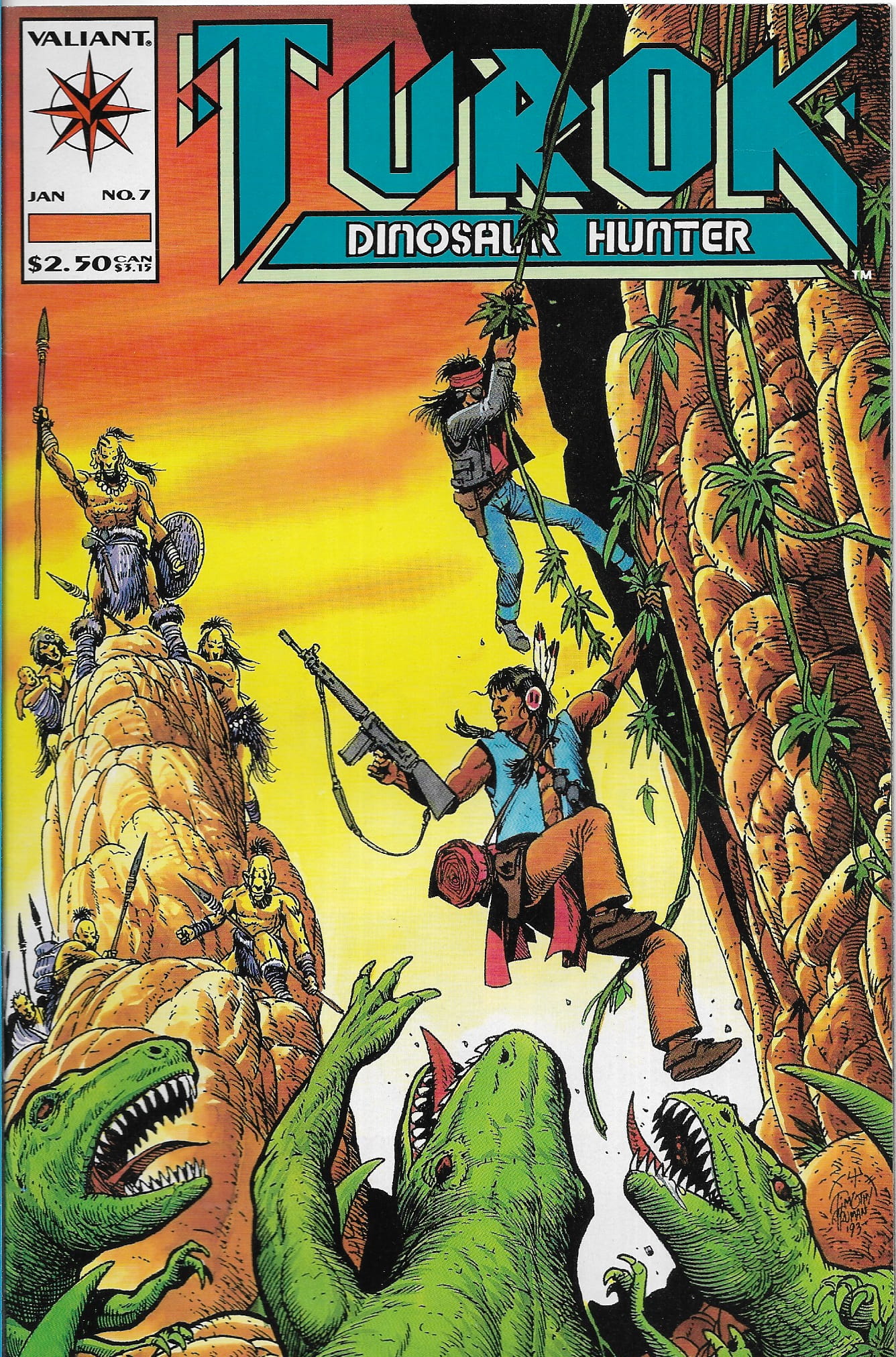 Wydawnictwo : Valiant Comics . Tytul : Turok : Dinosaur Hunter 7/1994 . Komiks w języku angielskim . 32 strony . Stan dobry : okładka lekko poprzecierana i poprzyginana .