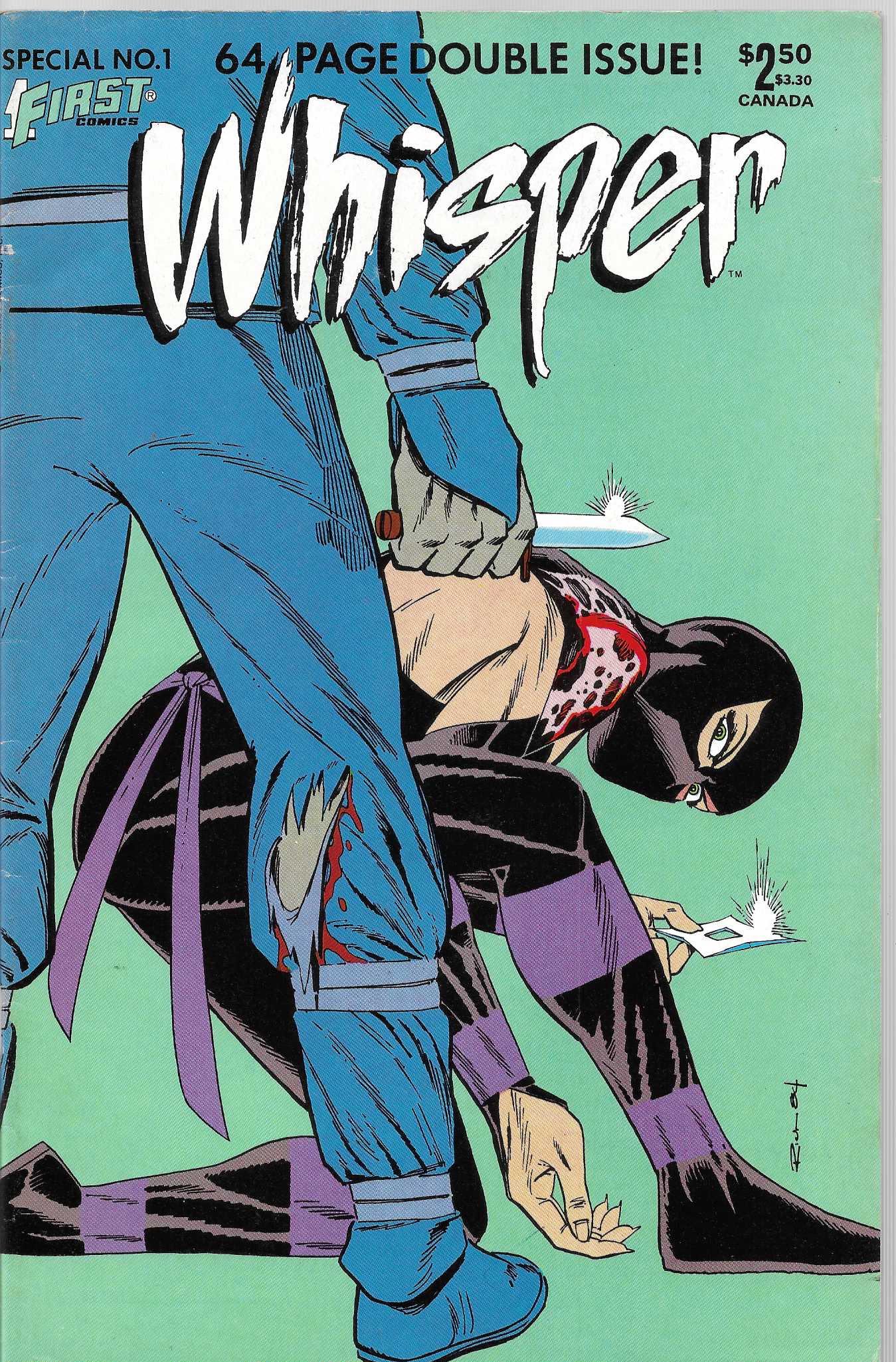 Wydawnictwo : First Comics . Tytul : Whisper Special 1/1985. Komiks w języku angielskim . Wydanie kolorowe . 64 strony . Stan Dobry : okładka lekko poprzecierana i poprzyginana . Minimalne zalamania na grzbiecie komiksu .