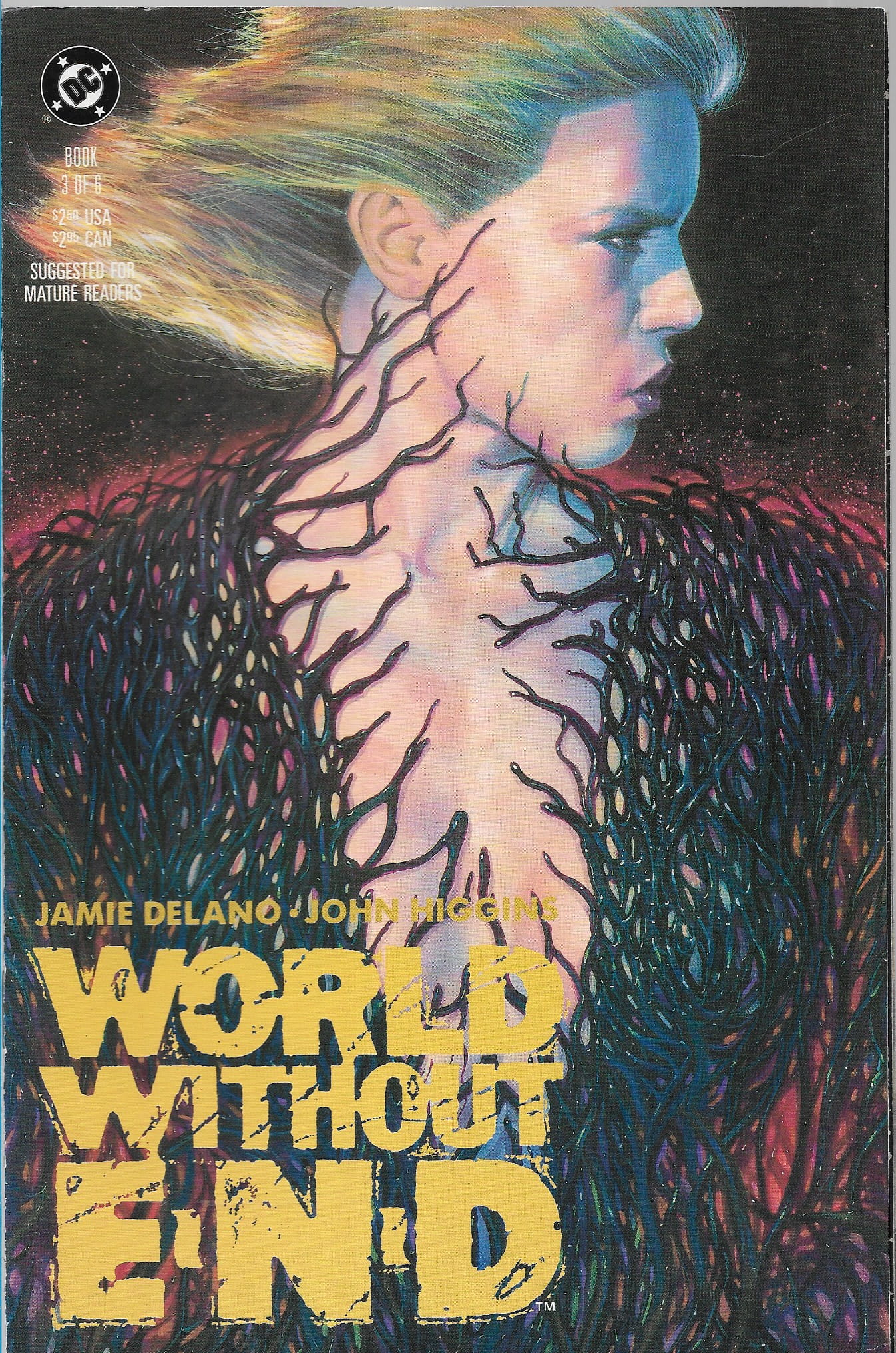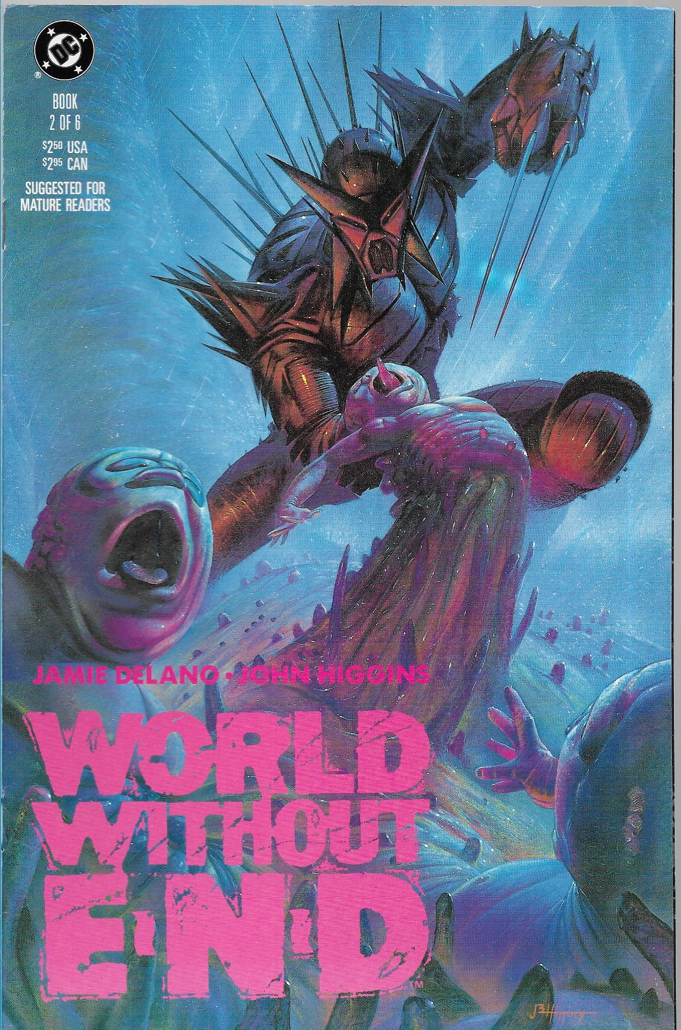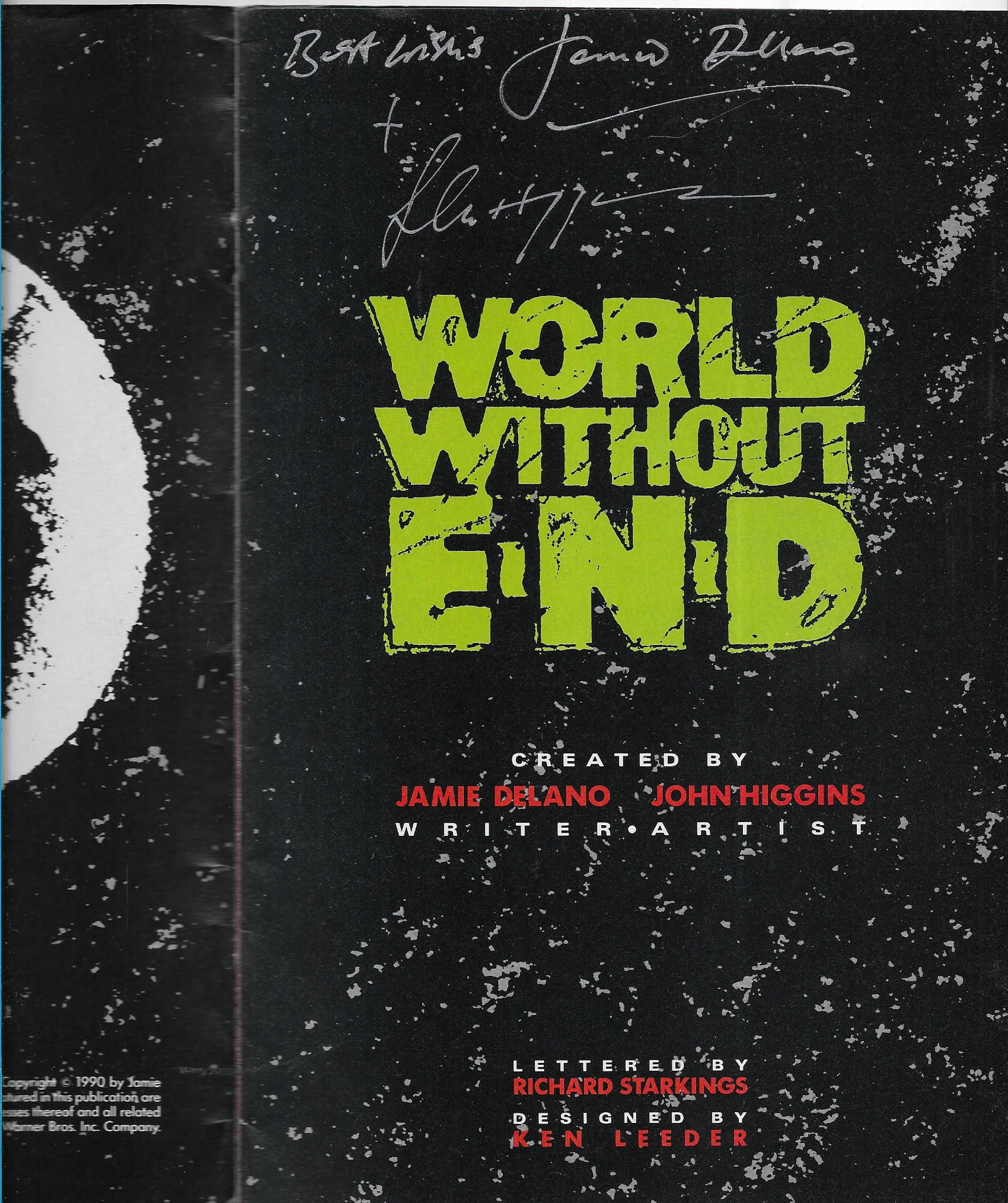 Wydawnictwo : DC Comics . Tytul : World Without End 1-6/1990 . Komiks w języku angielskim . Zeszyty po 32 strony . Stan Dobry : okładka minimalnie poprzecierana i poprzyginana . 1-6 , Komplet . Zeszyty nr.1,3,5 i 6 podpisane na pierwszej stronie przez obu tworcow komiksu : Jamie Delano i John Higgins !